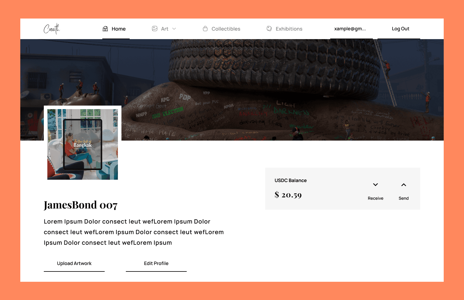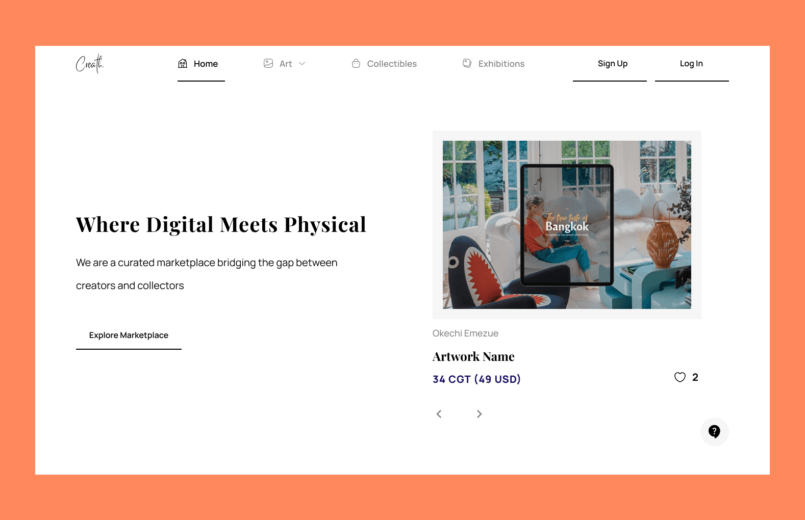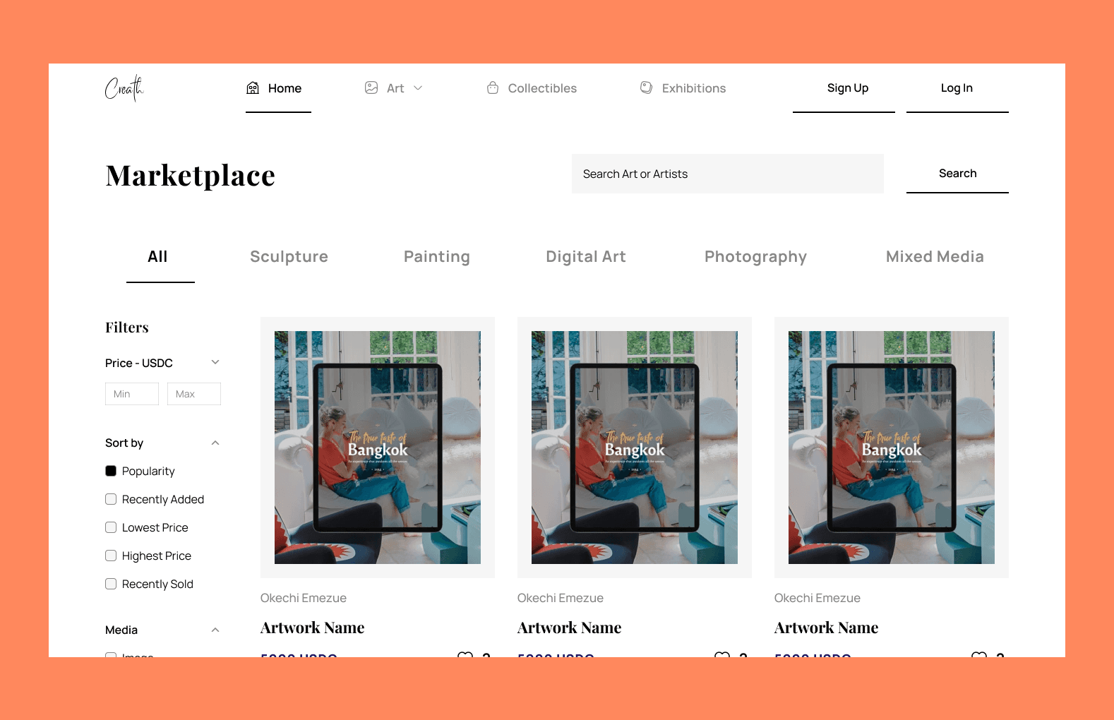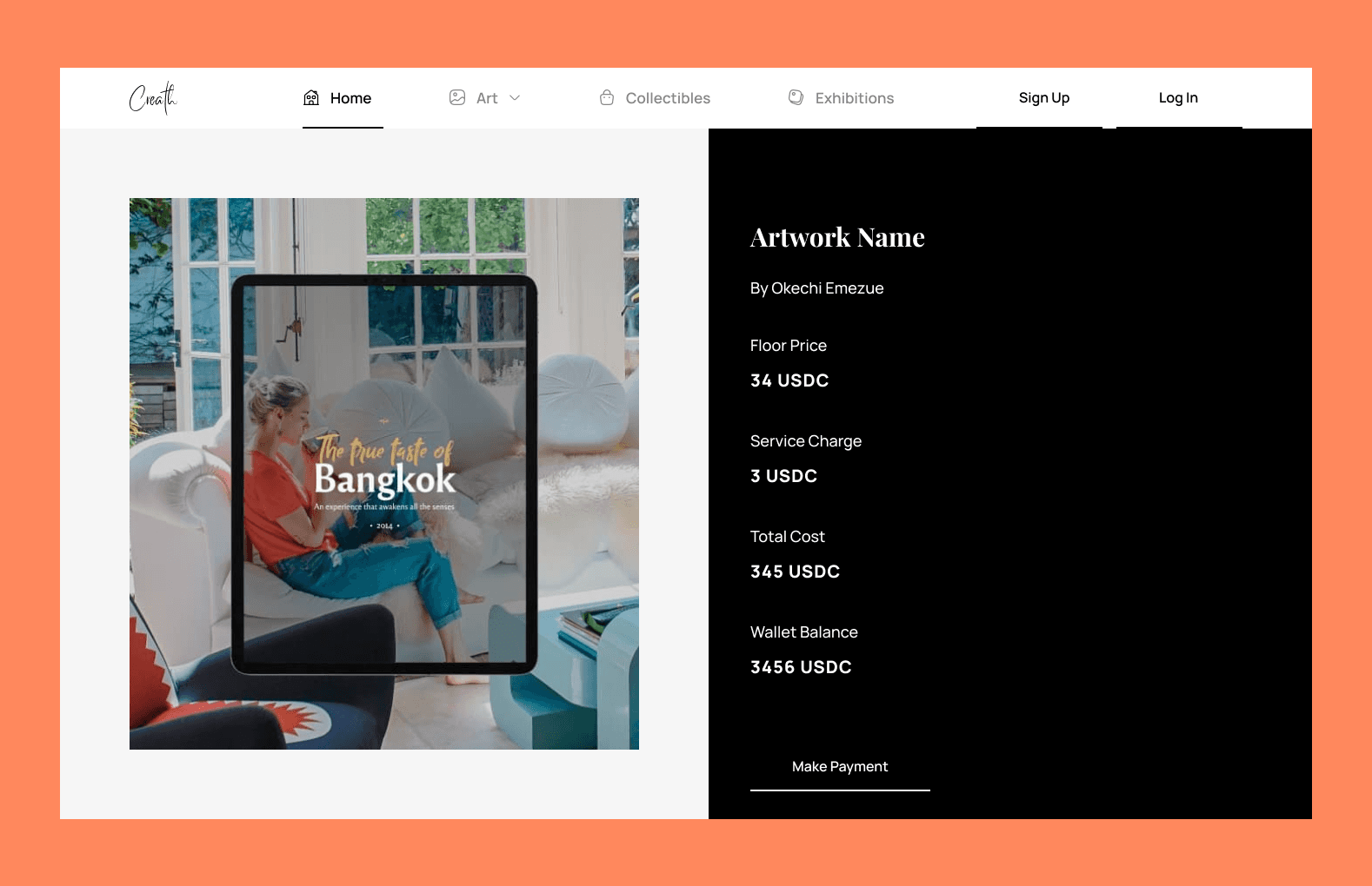 The Creath marketplace is built on the Ethereum Blockchain and designed to be a digital gallery for artists, curators, collectors, and art lovers. We connect creatives such as traditional artists, digital artists, photographers and sculptors with collectors.