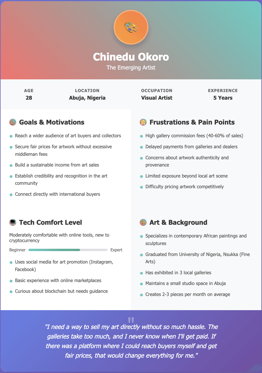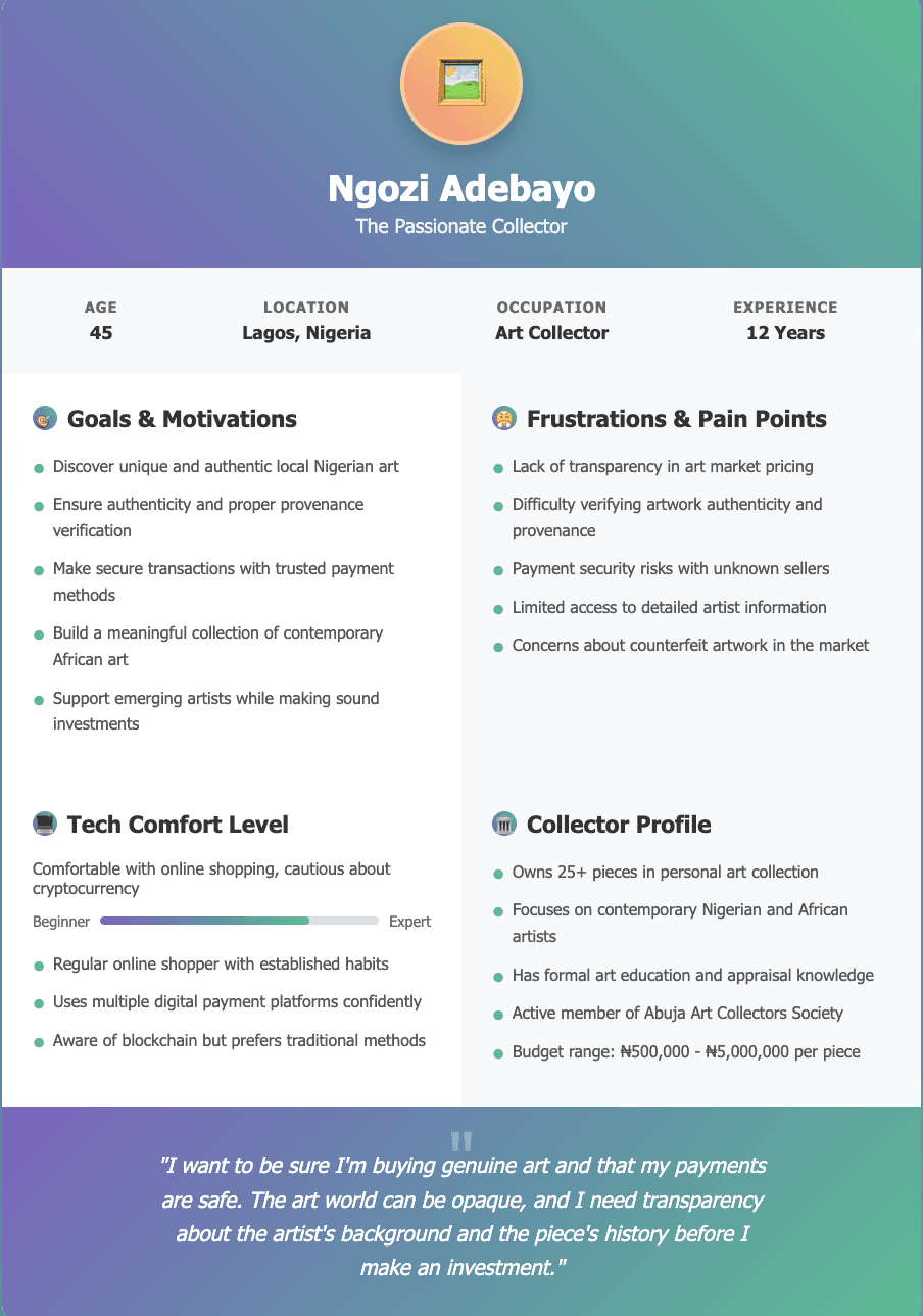 User Interviews: Conducted semi-structured interviews with 10 local artists (various mediums) and 8 art collectors in Abuja & Lagos to understand their pain points, needs, and expectations regarding an online art marketplace.